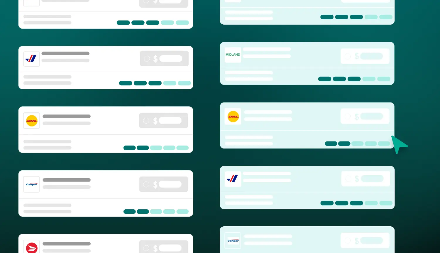 Entrez les détails de votre envoi et comparez instantanément les tarifs et les délais de transit en direct de Purolator, UPS, DHL, FedEx, Midland, Postes Canada et plus, sur un seul écran. La façon la plus rapide d’obtenir l’expédition de colis la moins chère au Canada et à l’international, avec une livraison sur laquelle vous pouvez compter.